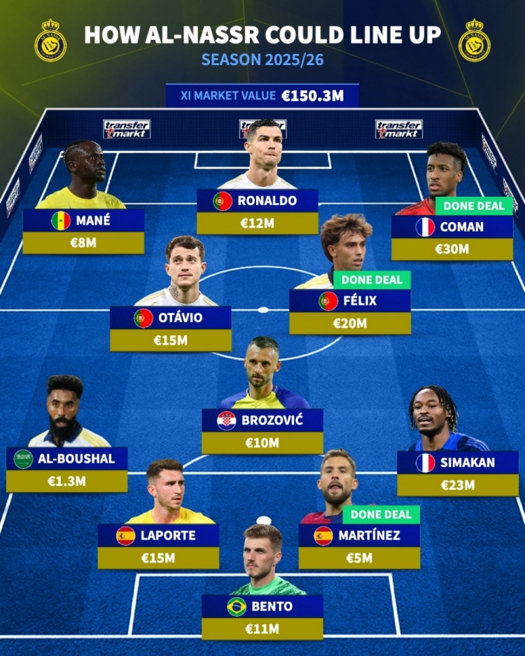 德转排利雅得胜利潜在首发(总价1.503亿欧)